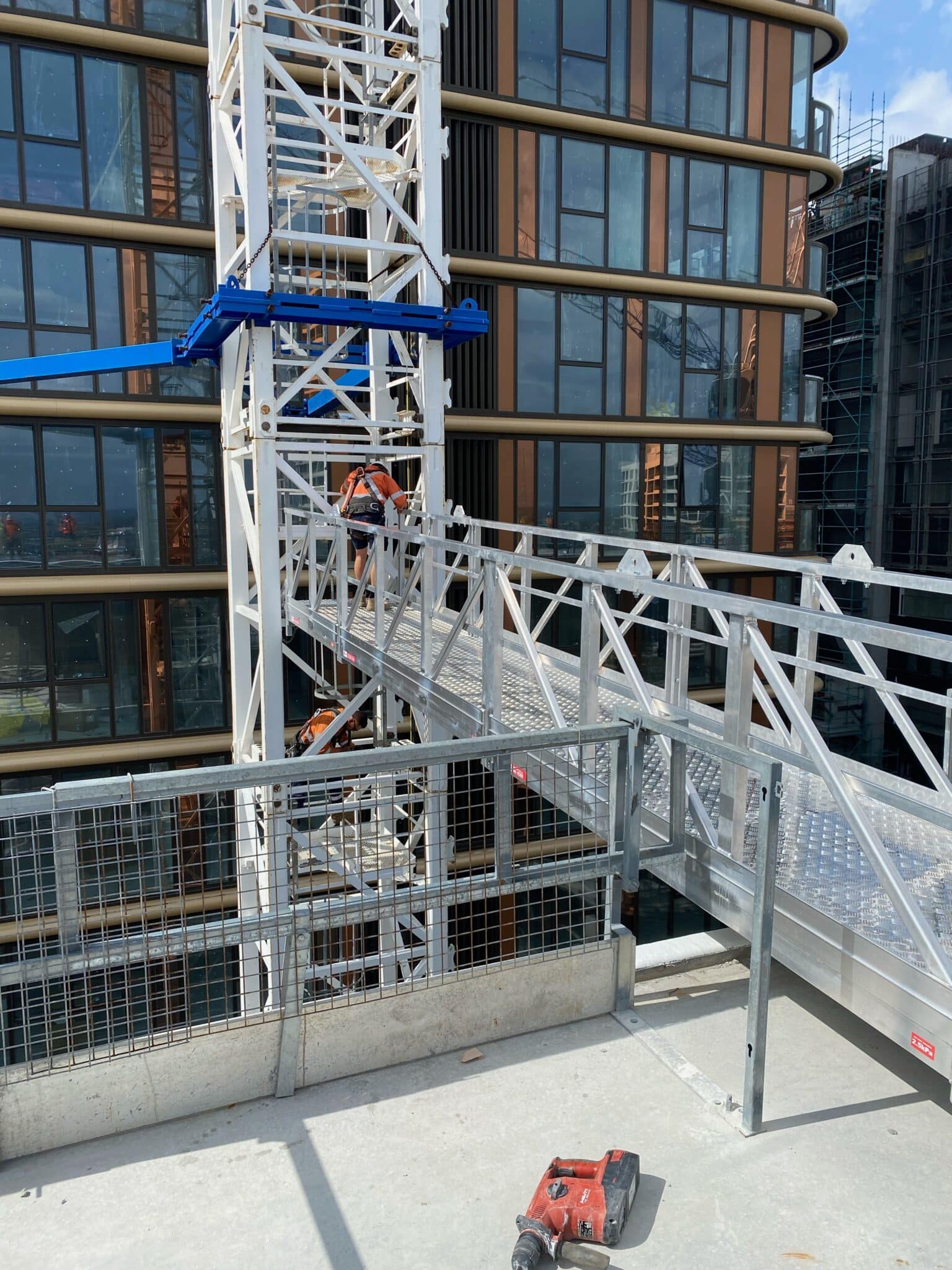 The AdaptaSpan Bridge Crane Access is designed to reduce various risks, specifically when accessing tower cranes. Often, multiple personnel are involved in the task, requiring a solution that not only secures their safety but also enhances productivity. The AdaptaSpan Bridge Crane Access is engineered to be assembled off-site and craned into position, maximizing productivity and minimising installation time.