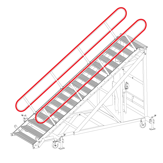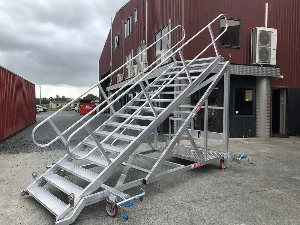 These height adjustable temporary stairs for construction are weight rated to 500kg and are compliant to New Zealand standards. 1200mm wide treads provide simultaneous two-way access between floors.