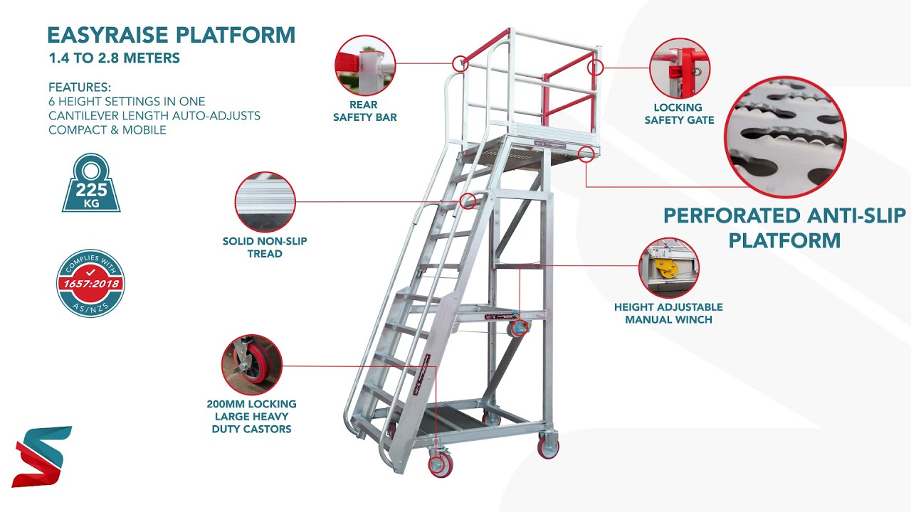 The EasyRaise Work Platform is an innovative and streamlined solution for industrial sites requiring adaptable access solutions. SafeSmart Access specifically designed this platform with a manual winch for height adjustment, allowing for quick changes between its six different height settings, ranging from 1.2m to 3.8m to accommodate multiple industrial applications.