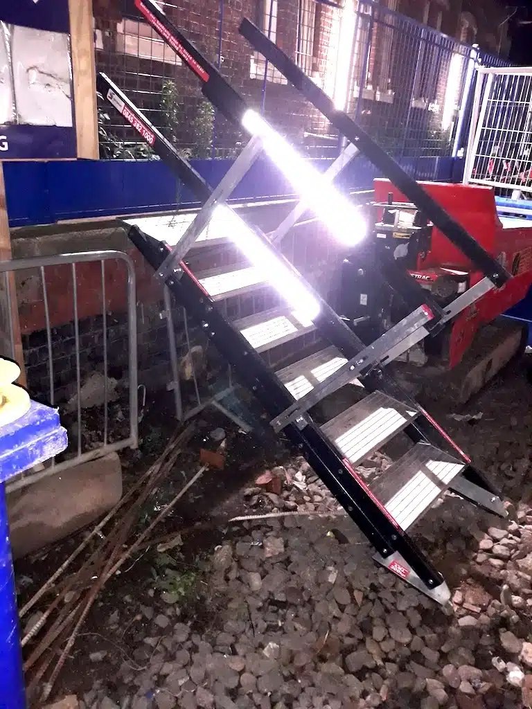 These non-conductive portable stairs are 600mm-wide and come in several heights/adjustment ranges 0.94m-1.3m to 1.1m-1.52m and feature a hefty 300kg weight rating, so carrying tools and other supplies whilst using the stairs is very safe.