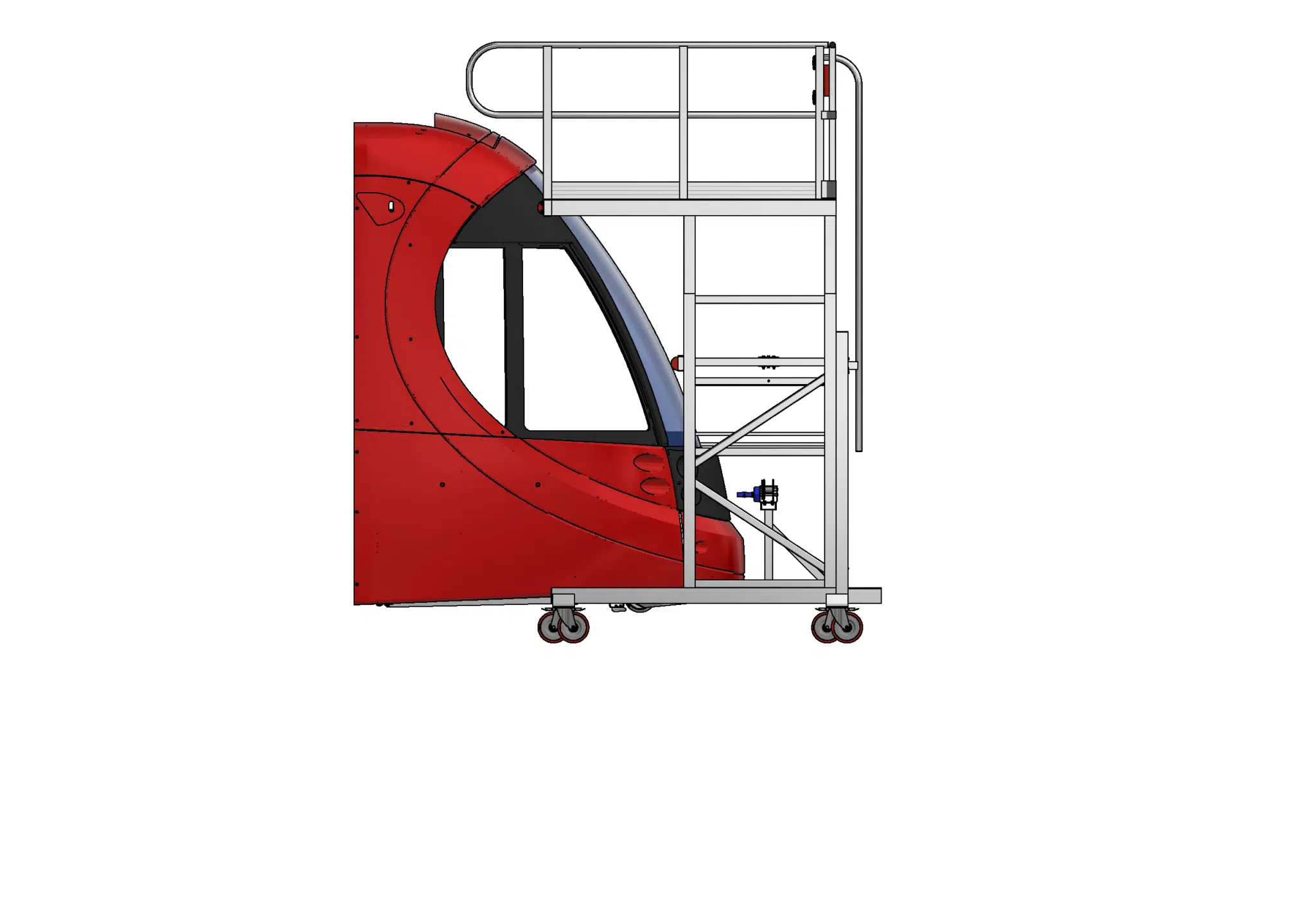The Front of LRV Adjustable Height Access Platform is designed to be both compact for typically smaller LRV stabling facilities, while providing a large working area for the tasks to be completed. The large range of adjustment in height also allows access to the roof area at the front of the LRV.