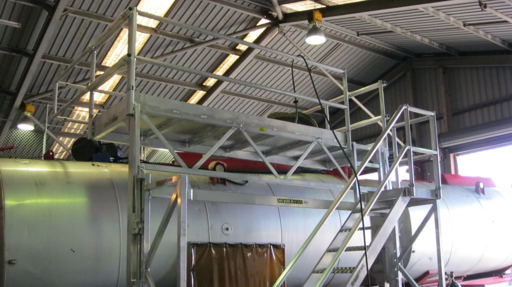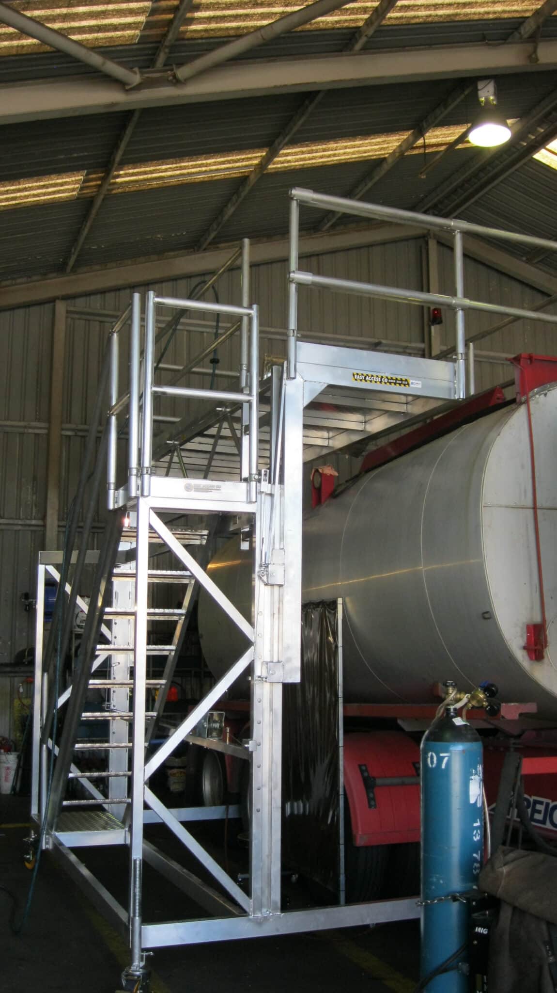 Heavy vehicles such as tankers can be difficult to gain safe and effective access to. This platform was designed for BHA in Sydney, who needed an adjustable height platform to safely access the hatches of their tankers. The telescopic handrails allowed personnel to safely step out on to the tanker roof to complete maintenance works.