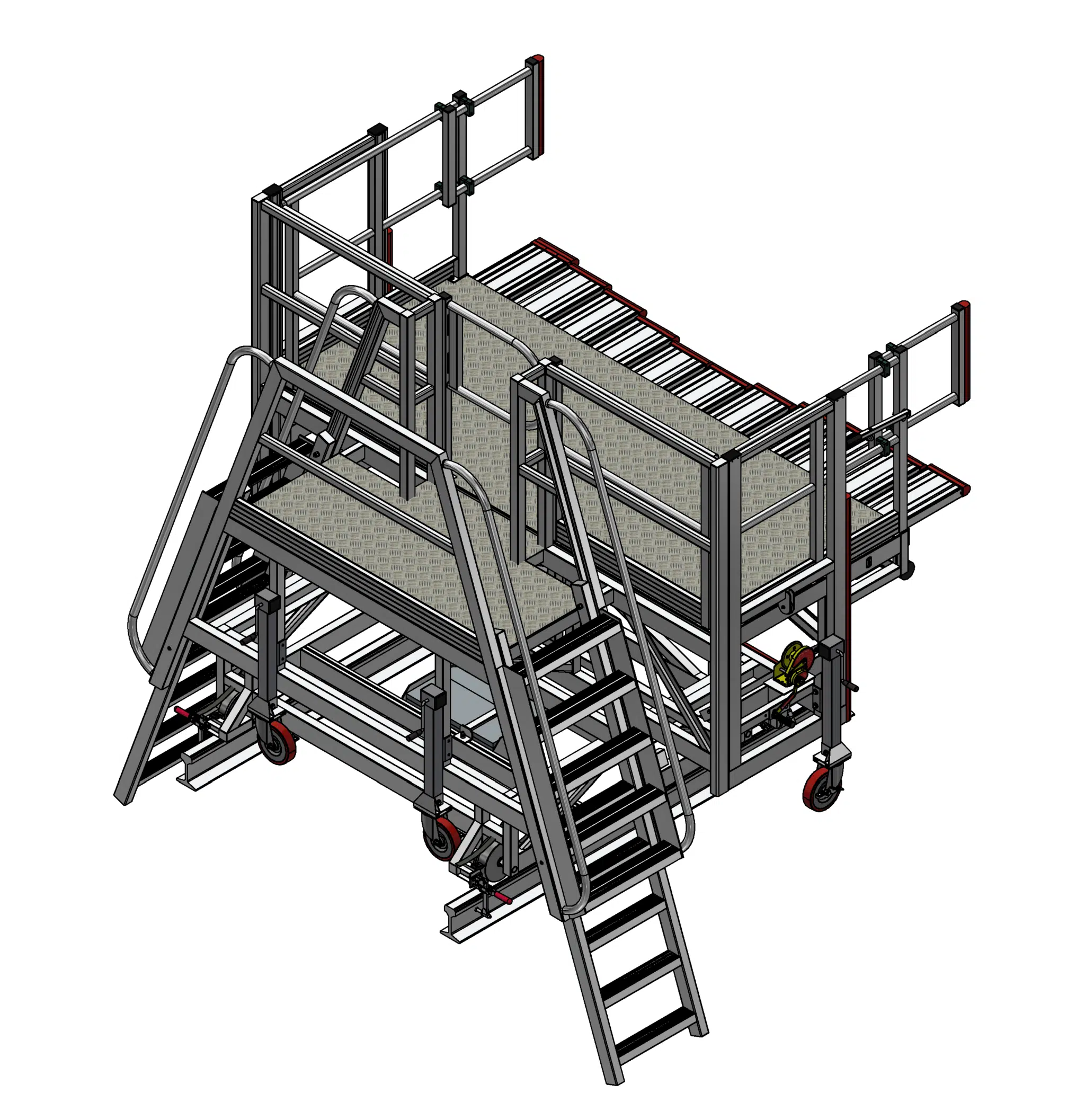 Significantly configurable, this platform will suit varying train profiles with the slider arrangement along the leading edge of the platform. In addition to suiting varying profiles, the platform is adjustable in height to allow work to be completed across the height of the front of the train. With ladder access that telescopes, allowing access from either the rail pit floor or accessible from the rail level, depending on the location of the train. The sliders utilise a ‘shark tooth’ mechanism that ratchets out and automatically locks where it is left. Each slider can be positioned different from the other. To release the sliders, a single handle is positioned on the handrail of the platform that when lifted allows all the sliders to be slid back to a stowed position simultaneously.