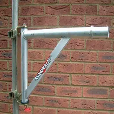 Ideal to clamp onto scaffolding as an extension out of the side of a structure to provide a secure place to attach a braking pulley. Made from lightweight aluminium it has a swivel function which provides better accessibility. It also has a safety locking pin for secure additional security.