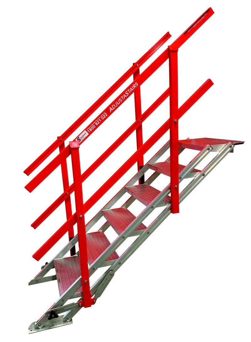 A development on our popular AdjustaStairs collapsible stairs adapted to securely attach to flatbeds trailer platforms.