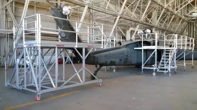 Custom designed for the US Army’s Black Hawk helicopters during a de-commissioning program. Also suits the Sea Hawk and other models based on the Black Hawk. A three-component work platform system for the nose, side and tail, that easily and quickly wheel up to the aircraft. SafeSmart Aviation here.