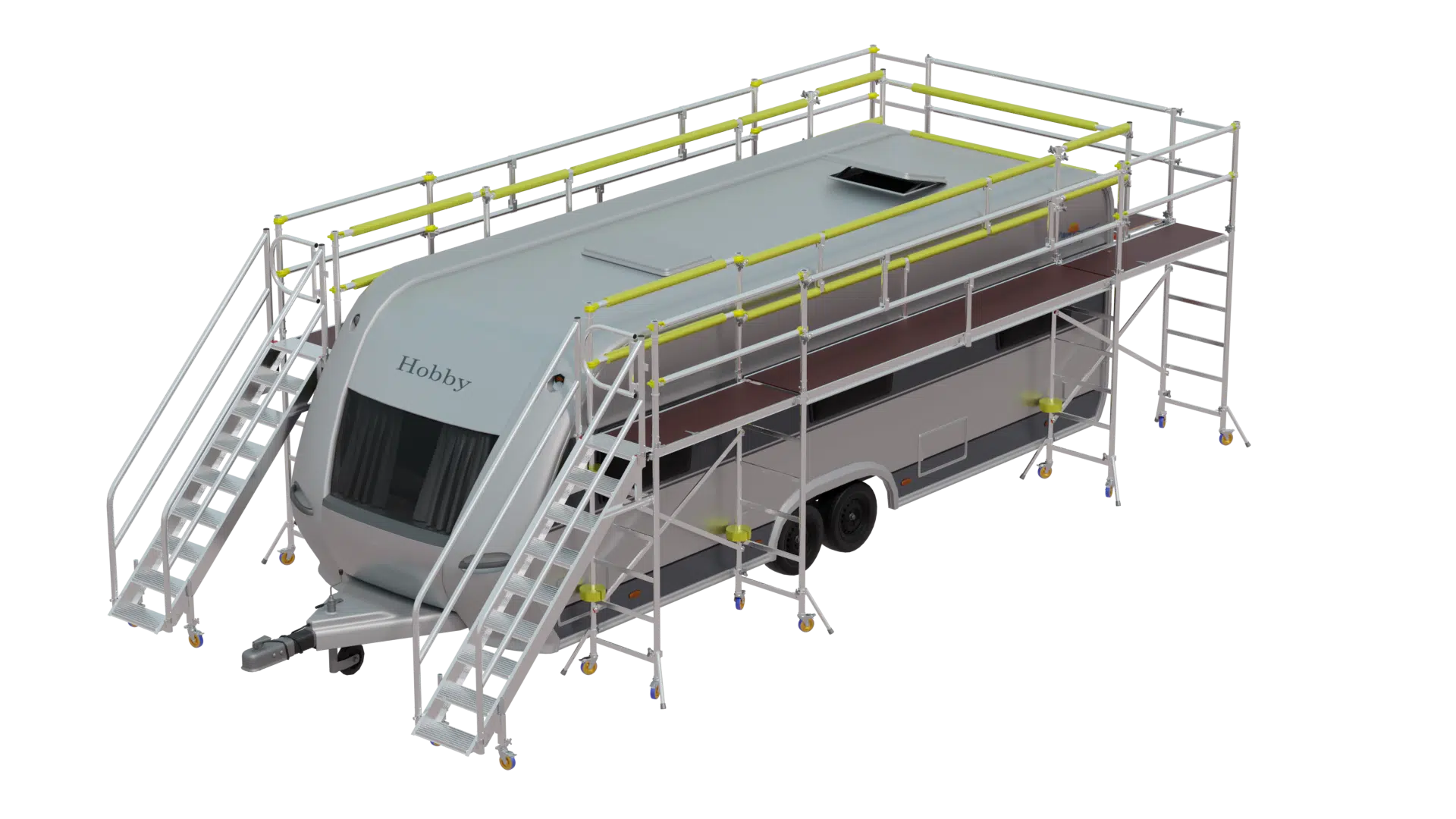 Utilising the proven components of our aluminium mobile scaffold system, including custom stairs, longboard packs, and corner packs, the U-Shaped Vehicle Access Platform seamlessly creates two side platforms and a rear joining platform. This configuration provides optimal accessibility and manoeuvrability, allowing workers to efficiently carry out caravan builds with ease.